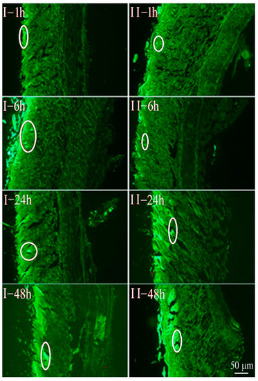 The fluorescence intensities of the two administered groups increased significantly with time, which indicated that the amount of drug entering the skin increased proportionately with time. However, at the same time, the depth of the inflammation-targeting emulsion gel into the skin was observed to be deeper than that of the non-targeting emulsion gel (Figure 1), which might be possibly due to the faster generation of electrostatic adsorption between the inflammation-targeting emulsion gel and the positively charged inflammatory tissues.