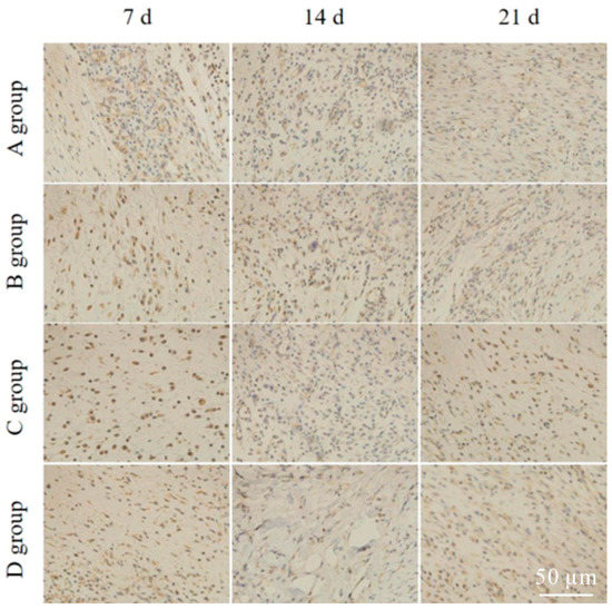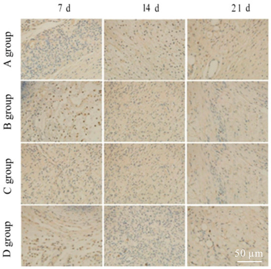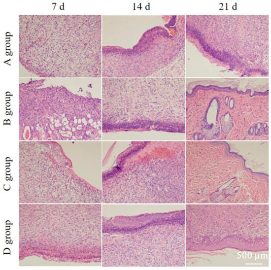 Four different fields were selected and photographed under a 10× ocular lens to observe the histological changes of rat wounds. At 7 days, the epidermal layer of each group was found to be thickened. There was a large amount of inflammatory cell infiltration in the dermal layer in group A, but it was less in the administration groups. At day 14, group B displayed a homogeneous tissue arrangement, whereas groups C and D had decreased inflammatory cell infiltration and increased numbers of the fibroblasts. At day 21, epidermal layer structures had formed in group A, and the dermal layer still showed more inflammatory cell infiltration with a few fibroblasts. The neoplastic epidermal layer of group D had a more well-defined tissue structure with denser collagen fibers and a few inflammatory cell infiltrates in the interstitium. On the contrary, Groups B and C showed an intact epidermal layer. The specific results have been shown in Figure 3.