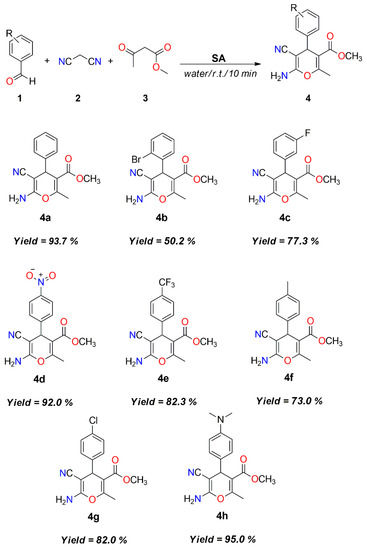 - Pagadala, R.; Maddila, S.; Jonnalagadda, S.B. An Efficient, Multicomponent, One-pot Synthesis of Tetra Substituted Pyrans in Water. J. Heterocycl. Chem. 2015, 52, 1226–1229. [Google Scholar] [CrossRef]