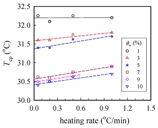 Plots of the cloud point Tcp at different heating rates for a-PNIPAM/H2O of different concentrations ϕw. The binodal temperature was derived from the extrapolated temperature at the zero heating rate.