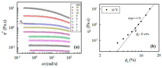 In addition, the measured values of the complex viscosity of the a-PNIPAM aqueous solutions at 10 °C and different frequencies are presented in Figure 2a, from which the zero-shear viscosity η0 was derived from the constant η* in the low-frequency region, that is, the Newtonian flow region. It should be noted that all the studied solutions (4–14 wt%) at 10 °C were in the one-phase solution state (discussed later). Figure 2b shows the log–log plots of η0 vs. the polymer concentration to determine the ϕe of the studied a-PNIPAM solutions; the slope increased at low ϕw and finally reached a constant slope of 4.79, thus suggesting the entrance of an entangled solution region. In this manner, ϕe was derived from the incipient concentration at 8 wt%, above which the relationship of η0 ϕw4.79 was maintained. The derived exponent was near the theoretical value of 4.7 for entangled polymers in the θ solvent. Our results showed that ϕe was about 8 wt%, which was independent of the solution temperature provided that the a-PNIPAM aqueous solution was in the one-phase state [38].