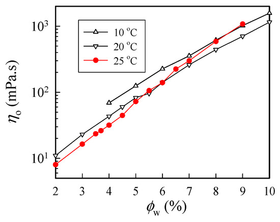 Figure 3 shows the concentration dependence of η0 measured at three selected temperatures of 10 °C, 20 °C, and 25 °C. As expected, η0 increased with increasing polymer concentration at a given temperature, and η0 was larger at 10 °C than that at 20 °C. However, at 25 °C, an anomalous increase in solution viscosity was seen for solutions with a concentration higher than 6 wt%. The solution viscosity of the 9 wt% solutions at 25 °C was even larger than that at 10 °C. Thus, these results indicate that chain structures at 25 °C in the a-PNIPAM/H2O solution may have been changed to alter its rheological properties. The anomalous feature arose because of the physical gelation caused by the enhanced chain associations, as ϕw was high.