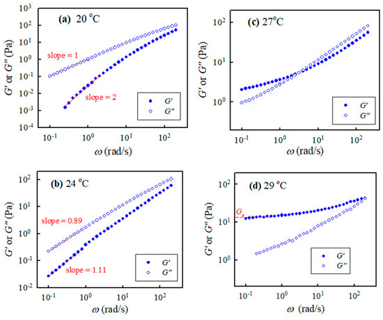 Storage modulus and loss modulus of the 10 wt% a-PNIPAM/H2O vs. applied frequencies at different temperatures of (a) 20, (b) 24, (c) 27 and (d) 29 °C.