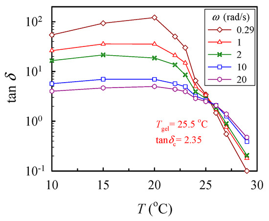 where n is the critical relaxation exponent and 1/λ0 denotes the crossover frequency to some faster dynamics (e.g., entanglement region and glass transition) [43]. With a series of frequency sweeps, the Winter-Chambon criterion defined by Equations (1) and (2) was unambiguously applied to identify the GP, at which the macroscopic network was incipiently developed. Based on Equation (2), the plots of tan δ (= G″/G′) as a function of temperature, with the frequency as a parameter, are shown in Figure 5, in which the crossover of the curves marks the gel point. Thus, the 10 wt% solution reached its gel point at 25.5 °C with a corresponding tan δc of 2.35, thus giving rise to an n value of 0.76. Similar analyses have been carried out to determine the corresponding values of n and Tgel for other a-PNIPAM solutions of different concentrations [38]. Our work showed that the derived values of n were independent of the ϕw, while Tgel decreased with increasing ϕw, being 29.5 °C and 25.0 °C for the 5 wt% and 12 wt% solutions, respectively.