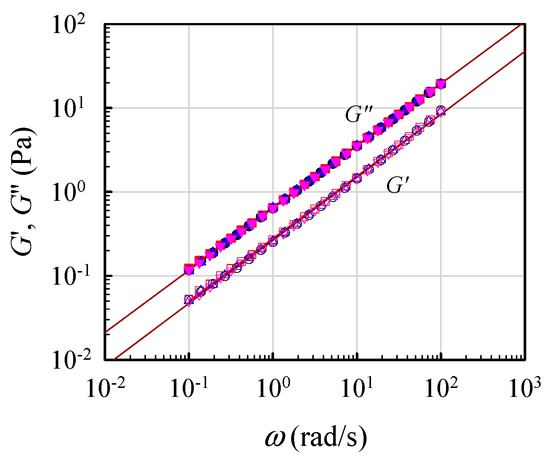 To validate the critical gel behavior, frequency sweep tests for the 7 wt% solutions were repeatedly performed at its derived Tgel for a time period of 12 h. Figure 6 shows the obtained results for four sets of data on G′(ω) and G″(ω) measured at 0.5, 4, 10, and 12 h after Tgel was attained. The superimposed data reveal that the critical gel behavior was unchanged, thus re-confirming that the G′(ω) and G″(ω) curves followed Equation (1) with an n value of about 0.75. Thus, the critical gel behavior was maintained over the long period of at least 12 h.