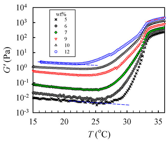To determine the critical temperature needed to reach the pregel regime, a temperature sweep test was performed to detect subtle variations of G’ at a low heating rate of 0.2 °C /min, as shown in Figure 7. The shapes of the measured G’ curves were similar for all tested solutions. For the 5 wt% solutions, upon heating from 15 °C, G′ gradually decreased with increasing temperature until 27.5 °C, at which an upturn was observed. The continuous decrease in G′ was attributed to an enhanced chain mobility at high temperatures. On the other hand, the upturn of the G′ curve indicates that the solution structure was altered. The initial temperature at which G′ upturns is denoted as T1 to indicate the onset variation of the solution structure and, therefore, the beginning of the pregel regime. Remarkably, a continuous and significant increase in G′ with a four-order magnitude enhancement at the temperature range of 27–34 °C was observed due to physical gelation and phase separation. With increasing ϕw, T1 was decreased; the derived T1 was about 22 °C for the 12 wt% solution. Therefore, we conclude that the one-phase solution underwent pronounced concentration fluctuations at temperatures above T1. The thermal concentration fluctuations subsequently triggered the physical gelation process to develop a macroscopic-scale gel network at Tgel.