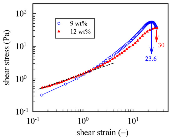 Startup of shear experiment of 9 wt% and 12 wt% a-PNIPAM hydrogels at a temperature 1 °C higher than their Tgel. For both gels, a constant shear rate of 0.05 s−1 was applied up to a strain of 30.