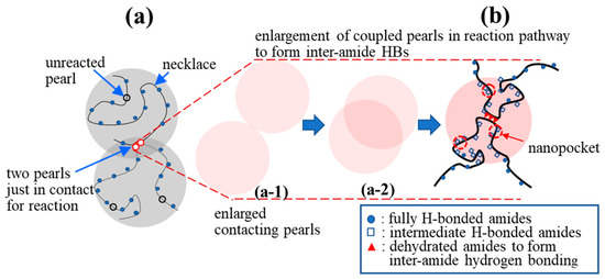 There are no dehydrated NIPAM units in the hydrophilic necklaces used for the cooperative hydration of bound water [16] (Figure 10a). On the one hand, it is difficult for two crossing necklaces to form a gel junction. On the other hand, interchain association is likely to occur between two contacting pearls in which dehydrated segments reside and possess a long enough lifetime to develop coupled pearls via inter-amide hydrogen bond formation. The contacting of the pearls, driven by a hydrophobic interaction, is the first step, followed by “pearl coalescence” that reduces the total hydrophobic surface to eventually develop a “coupled” pearl (Figure 10b). Meanwhile, in the overlapping region of the “coupled pearls”, an inter-amide hydrogen bond (HB) becomes able to develop a firm interchain connection [48]. Figure 10 also illustrates an irreversible physical reaction pathway from part (a-1) to (a-2) and from (a-2) to (b). The irreversible process is stochastic and driven by the gain of free energy brought about by the reduction in enthalpy because of the hydrophobic interaction and inter-amide hydrogen bonding, which outweigh the cost of the free energy caused by the translational and rotational entropy loss of the segments, accompanied by the process from (a-1)→(a-2)→(b).