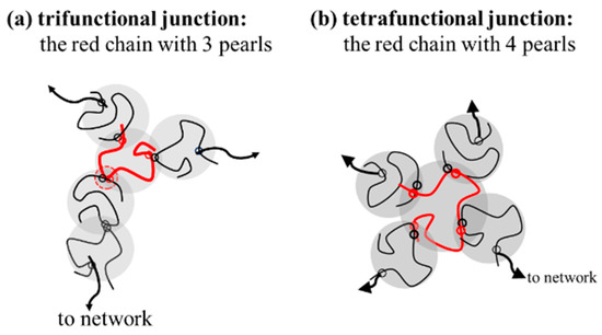 The specific red chains with 3 and 4 pearls acting as (a) trifunctional junction (f = 3) and (b) tetrafunctional junction (f = 4).
