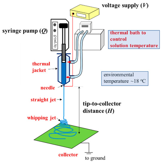 Low-temperature electrospinning process designed to ensure the continuous electrospinning of a one-phase a-PNIPAM aqueous solution. A thermal jacket was used to enclose the polymer solution to maintain a desired temperature (Tsolution), controlled by a thermal bath with circulating water. The processing parameters are Q, V and H. The environmental temperature was fixed at 18 °C.