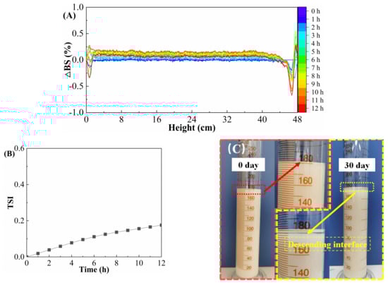 The rate of the backscattered light (ΔBS) and Turbiscan stability index (TSI) values of the SACM were measured by a Turbiscan Lab stability analyzer (Formulaction Company, Toulouse, France) to analyze its static stability for 12 h. The scanning height was 48 mm and the test temperature was 25 °C. We set a near-infrared light source (λ = 850 nm) and scanned the sample along the axial height every 40 μm; the ACM was scanned 12 times in 12 h.