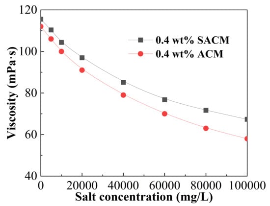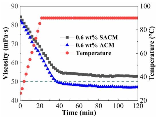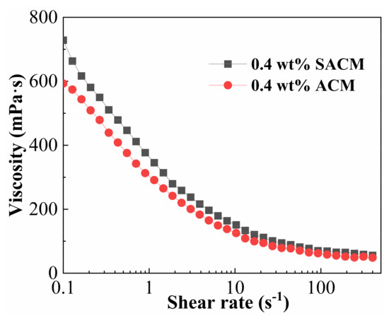 For the suspension, the dissolution was based on the following steps: In a 800 mL beaker, 4.0 g of SACM was quickly injected into 396 g of 100,000 mg/L simulated brine to obtain a suspension diluent with a thickener concentration of 0.4 wt% under gentle stirring (300 rpm). For the powder thickener, a mechanical stirrer was adjusted to 300 rpm, the designed dosages of ACM were subsequently added to the 100,000 mg/L simulated brine, and then rotational speed was regulated to a low gear at 100 rpm to obtain 0.4 wt% thickener solution. Every 1 or 5 min, the suspension or powder solution was taken out for viscosity measurement by using a HAKKE MARS40 rheometer (HAAKE, Karlsruhe, Germany) with Cup Z43 cylinder plate (diameter = 43 mm) and CC41 rotor (diameter = 41 mm) at a shear rate of 170 s−1 and 25 °C.