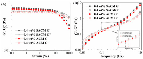 The viscoelasticity of suspension diluent and powder solution. (A) Strain scanning curve. (B) Frequency scanning curve.