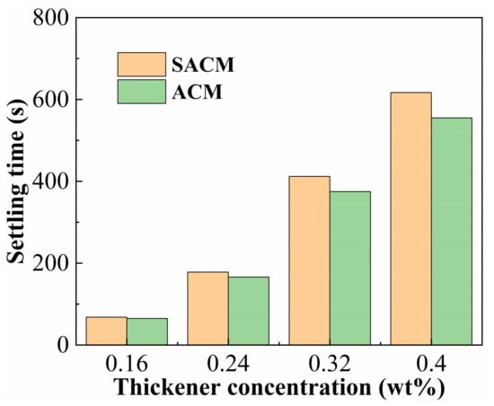 It is necessary to measure the sand-carrying property of suspension diluent and powder solution. Thickener solutions of different concentrations were chosen to test the average time it took for five particles of ceramsite to fall in a volume of 250 mL; the results are shown in Figure 8. When the thickener concentration was lower than 0.24 wt%, the settling time of the proppant in both kinds of thickener solutions was basically the same. When the concentration of powder reached 0.40 wt%, the proppant achieved a settling time of 556 s under static conditions, indicating that the powder possessed a good sand-carrying property. During the actual fracturing process, the thickener solution was flowing at high speed, so the sand-carrying property was greater. The settling time of the 0.40 wt% suspension solution increased to 617 s; the settling time of the suspension solution was apparently higher than that of the powder solution when the thickener concentration was larger than 0.40 wt%. This indicates that the sand-carrying performance of the thickener solution was improved after the addition of nanomaterials [33].