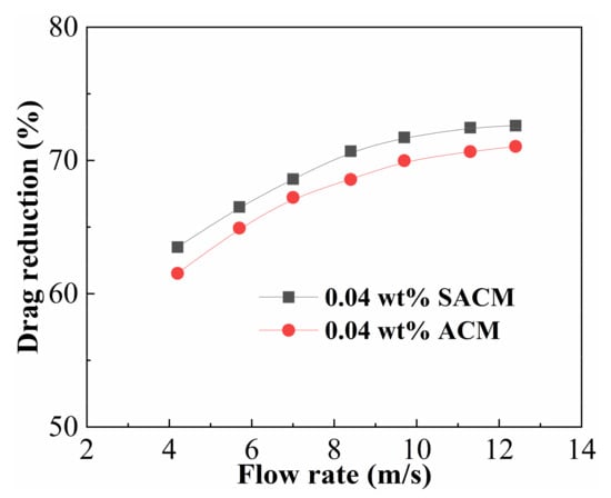 Figure 9 compares the experimental results of drag reduction performance for suspension diluent and powder solution at a thickener concentration of 0.04 wt%. The drag reduction rate increased when the flow rate increased from 2.4 m/s to 10.2 m/s; the maximum drag reduction rate was 72.6% and 70.9% for suspension diluent and powder solution, respectively. When the thickener solution started to flow, the conformation of thickener molecules changed from the coil to extension under external flow, resulting in a strong inhibition of the formation and further development of vortices, so the drag reduction rate increased gradually. As the flow rate increased, the molecular chains reached full extension and the confinement of turbulence vortices became more effective, corresponding to the maximum drag reduction rate [35]. The drag reduction rates of suspension and powder had a similar variation trend, but the drag reduction rates of the suspension were higher than those of the powder at the same flow rate, and a wider range of high drag reduction was obtained by the suspension. This result could be attributed to the reinforced interactions between the nano-silica and the thickener matrix, When the nanosilica was introduced, it provided more bridge nodes and enhanced the strength of the spatial network. The well-dispersed nano-silica in the thickener matrix could reduce the degradation of thickener molecules by improving molecular rigidity, enhancing the resistance to the shear action and hindrance to vortices, thus showing better drag reduction performance in the turbulent state [46].