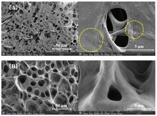 The morphology of the thickener solution with a thickener concentration of 0.4 wt% was analyzed in depth by SEM. Figure 11A,B shows the SEM images of suspension diluent and powder solution. Although these two fluids exhibited similar network structures, the network structure became denser with the introduction of nano-silica. Nano-silica particles (yellow dotted line) acted as connection points between the thickener chains, resulting in a denser skeleton. In addition, the dispersed nano-silica remained relatively uniformly distributed in the fracturing fluid, without visible agglomeration.