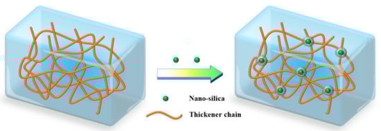 Figure 12 helps to visualize the reasons for the behavior of the suspension diluent. Firstly, the mobility of thickener chains surrounding the nano-silica in solution was inhibited by the steric hindrance of the nano-silica, leading to an increased stability of the network. Secondly, nano-silica particles acted as crosslinkers by attaching several molecule chains. At the same time, each thickener chain might be absorbed by a different nano-silica particle. This bridging action resulted in the formation of the complex macromolecule network, which improved the structure strength. In addition, the presence of hydrogen bonds between the thickener matrix and the nano-silica restricted the local movement of thickener chains, leading to a stronger spatial network [49]. As a result, these synergistic effects greatly enhanced the performance of the suspension diluent.