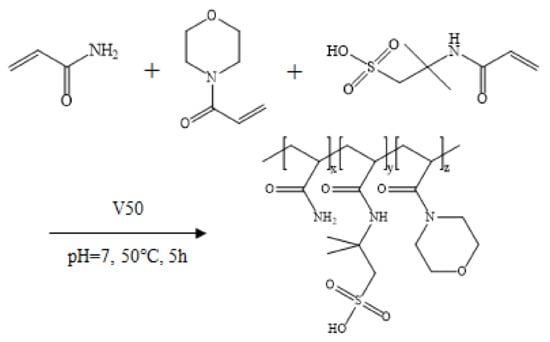 The synthetic reaction was conducted in a three-necked flask equipped with a magnetic stirrer. Certain proportions of AM (91.6 g, 1.289 mol), AMPS (20.8 g, 0.100 mol), and ACMO (7.8 g, 0.055 mol) were added to deionized water under an inert nitrogen atmosphere for 30 min; the total monomer concentration was maintained at 30 wt%, and the pH value was adjusted to 7.0 by using sodium hydroxide solution. V50 solution serving as the initiator was added using a syringe; the dosage of V50 was 0.1 wt% of the total mass of the monomers. The solution was stored at 50 °C for 5 h. The obtained product was cut into small pieces and purified by using ethanol precipitation three times. Finally, the powder thickener was acquired after vacuum drying and granulation; the powder thickener had a size of 100/120 mesh and was named ACM. The synthesis process of ACM is presented in Figure 13.
