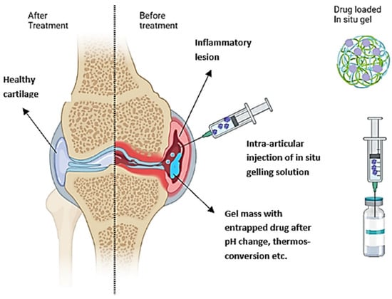 Of particular interest in IA delivery of gels are in situ forming hydrogels, which can be injected as solutions and suspensions but gel under physiological conditions such as a change in pH, temperature, or ionic composition (Figure 1). The viscoelastic properties of the system enable the measurement of precise doses before administration and retention in the joints after injection due to gelation [12]. The gelation at the injection site provides a depot for the slow and continuous release of the incorporated drug. Such formulations increase drug bioavailability and achieve high local drug concentrations while minimizing systemic toxicity by decreasing dosing frequency.