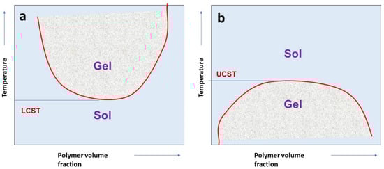 Sol-gel phase transition behavior of thermosensitive polymers (a) at lower critical solution temperature (LCST) and (b) at upper critical solution temperature (UCST).