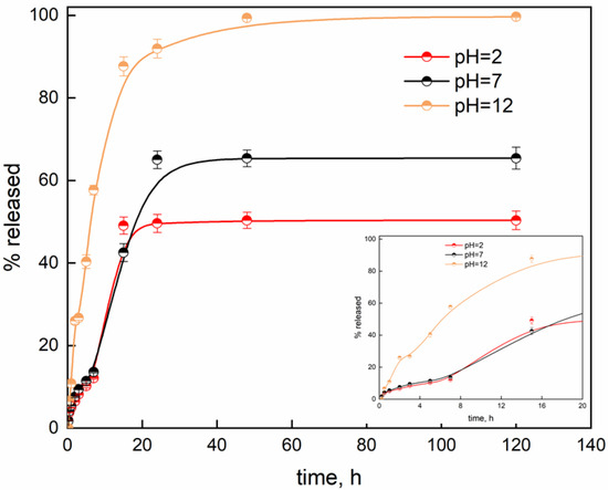 2.5. Release Kinetics of Encapsulate Hydrogels Beads