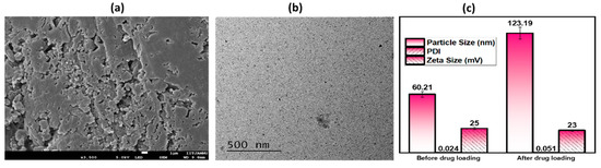 Physicochemical analysis: (a) FE-SEM image of gel prepared from FEO–PLGANPs; (b) TEM image of prepared gel; (c) measurements of particle size, polydispersity index and zeta potential of gel prepared from FEO–PLGANPs before and after drug loading.