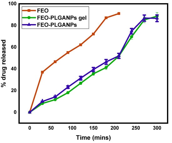 Figure 2 shows the comparative in vitro drug release profile of naked FEO, FEO–PLGANPs and FEO–PLGANPs gel (as topical gels). Then, the amount of drug released was measured in the selected media, i.e., buffer solution with pH 6.8. The amount of drug released varied depending on the formulation selected. In the in vitro drug release study, it was observed that more than 60% of naked FEO was released within 120 min, in contrast to FEO–PLGANPs gels (31.43%) and FEO–PLGANPs (26.76%). A total of 90% of the drug was released within 210 min in the case of FEO. The release of ug was maximal in the simulated intestinal fluid. The highest FEO release rate was found to be 88.55% for FEO–PLGANPs gels and 86.63% for FEO–PLGANPs in a buffer solution with pH 6.8 after 300 min. The drug release from topical gels was significantly higher than that of the corresponding FEO and FEO–PLGANPs.