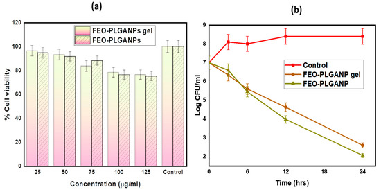 (a) Comparative in vitro cell viability assay of FEO–PLGANPs gel and FEO–PLGANPs; (b) Time-kill assay of the control, FEO–PLGANPs gel and FEO–PLGANPs.