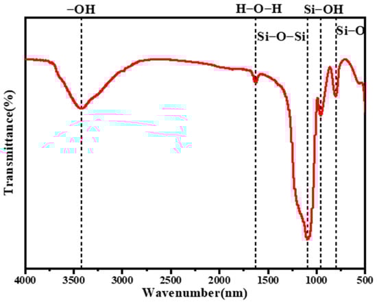 Figure 1 showed the FTIR spectrum of SiO2 aerogels, in which 3422 cm−1 was the antisymmetric stretching vibration peak of -OH and 1627 cm−1 was the bending vibration peak of H-O-H; 1094 cm−1 was the antisymmetric stretching vibration peak of the Si-O-Si group, which belonged to the characteristic peak of SiO2, indicating that the main component of sample was SiO2; 957 cm−1 was the stretching vibration peak of Si-OH, and this group was the main reason for the hydrophilicity of SiO2 aerogel; 802 cm−1 was the symmetric stretching vibration peak of Si-O, which also belonged to the characteristic peak of SiO2.