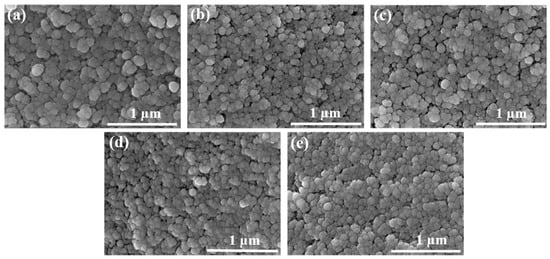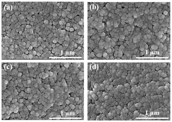 However, When the mass fraction of TMOS was 45 wt.% and the concentration of NH4OH solution was 0.15 mol/L; 0.30 mol/L; 0.45 mol/L; 0.60 mol/L and 0.75 mol/L, the size of SiO2 particles and pores decreased with the increase in the concentration of NH4OH solution, and the structure tended to be denser, as shown in Figure 3. It was attributed to the high catalyst concentration improving the speed of gelation, so that the silicon source can rapidly hydrolyze and condense into primary particles. Then, due to the depletion of the silicon source, the formation of secondary particles lacked raw materials at the later stage, so the clustering process stopped abruptly, resulting in smaller SiO2 particles, smaller pores, and more uniform distribution [24].