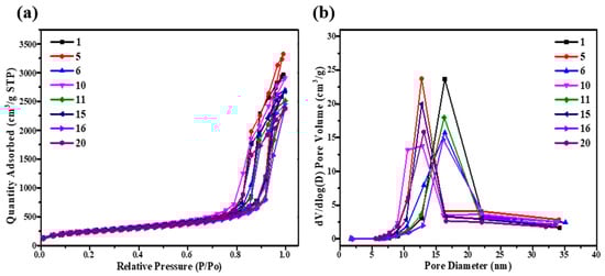 Moreover, as shown in Figure 4, the effect of silicon source content and catalyst concentration on the microstructure was also illustrated. Figure 4a showed the N2 adsorption-desorption isotherm curves of SiO2 aerogels which belonged to the type IV, a typical characteristic of mesoporous materials [21]. With the increase in TMOS mass fraction, the specific surface area gradually decreased. On the contrary, with the increase in NH4OH solution concentration, the specific surface area increased accordingly. This was mainly because more silicon sources, the hydrolysis and condensation reaction will be more sufficient, and more SiO2 particles can be generated to secondary particles, as well as the catalyst enabling the reduction of SiO2 particle size by rapid gel process. As shown in Figure 4b, it can be seen that the pore size distribution of each sample was mainly concentrated between 10 and 20 nm, which was divided obviously into two concentrated points due to the different concentration of NH4OH solution. When the concentration of NH4OH solution was low, it was between 15 and 20 nm with wide distribution, and when the concentration of NH4OH solution was high, it is between 10 and 15 nm with narrow distribution. However, the pore size of the NH4OH solution with the same concentration and different TMOS content was roughly the same. Therefore, the effect of NH4OH solution concentration on the pore size distribution was more significant.