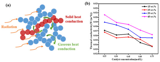 As shown in Figure 5a, there are three ways of heat conduction in aerogels: solid-phase heat transfer, gas convection heat transfer, and radiation heat transfer. In general, radiation heat transfer is ignored at room temperature [1]. Figure 5b showed the thermal conductivity of SiO2 aerogels. It can be seen that with the increase in TMOS mass fraction, the thermal conductivity increased, because higher TMOS mass fraction led to higher bulk density, resulting in an increase in the solid-phase heat conduction of the network skeleton. However, the thermal conductivity of 15 wt.% aerogels was slightly higher than that of 25 wt.%. Maybe because too little TMOS content led to larger pores, resulting in higher gas convection heat transfer. At the same time, when the mass fraction of TMOS was same, the thermal conductivity decreased with the increase in the concentration of NH4OH solution. This was owing to a high catalyst concentration, which led to smaller SiO2 particles and pores, which limited the solid-phase heat transfer and gas convection heat transfer, resulting in a lower final thermal conductivity.