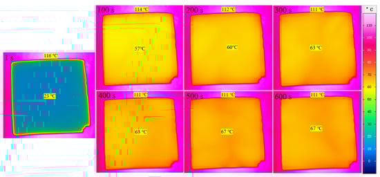 Figure 6 showed the infrared thermal imaging of the SiO2 aerogel. It can be seen that the surface temperature of the SiO2 aerogel tended to be stable after 300 s, and the temperature difference ΔT = 44 °C at 600 s, which was about 40% of panel temperature, indicating that the highly transparent SiO2 aerogel had excellent thermal insulation performance.