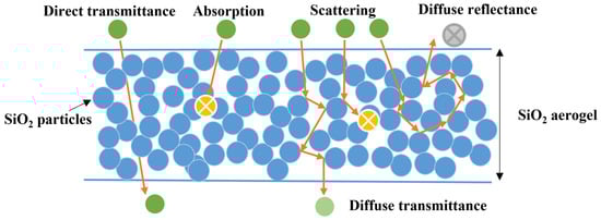 As shown in Figure 7, SiO2 aerogels themselves have a very low absorption of light. When SiO2 aerogels are irradiated by a beam of light, it may interact with the scattering source in the aerogels and then weaken the intensity of transmittance. According to the Rayleigh-Gans theory, the smaller the size of the SiO2 aerogels structural unit, the smaller the extinction coefficient and the higher the transmittance [41]. Therefore, the optical transparency of SiO2 aerogels was related to the gel structure construction [41,42]. The optimization of composition and microstructure control are effective strategies to improve the high performance and multi-performance of SiO2 aerogels [1].
