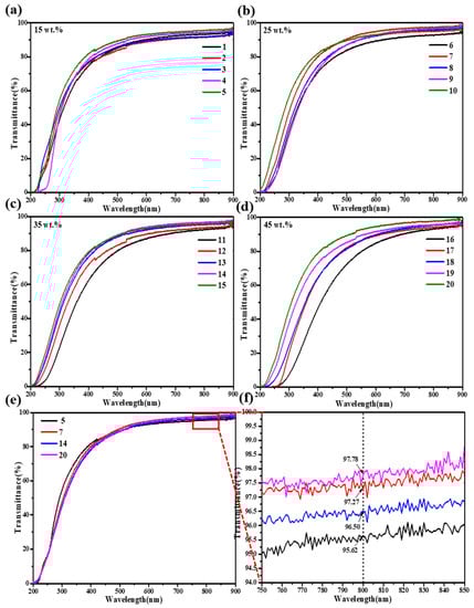 Transmittance curves of SiO2 aerogels with different TMOS mass fractions: (a) 15 wt.%; (b) 25 wt.%; (c) 35 wt.%; (d) 45 wt.%; (e) the highest transmittance among the TMOS mass fractions of 15–45 wt.% and its (f) local magnification of wavelengths from 750 nm to 850 nm.