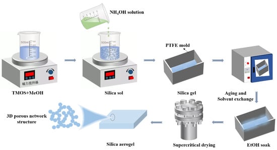 Aerogel [1] is a typical thermal insulation material with a three-dimensional (3D) porous network structure connected by nanoparticles. It has been widely used in numerous fields due to its many unique characteristics and properties, such as low density, high porosity, extremely low thermal conductivity and excellent acoustic properties. SiO2 aerogel [2] with excellent optical transparency has emerged as the most representative aerogel due to its inexpensive cost and straightforward preparation process [3,4,5,6]. Transparent SiO2 aerogel [7,8] has been utilized extensively in Cherenkov detectors [9,10], thermal insulation [11,12,13,14,15], energy-saving [13,16,17,18,19], photoelectric materials [20,21,22], wearables fields [23], thermal collectors [24,25,26,27,28], adsorbents and sensors. Thus, transparent SiO2 aerogel has great research value and the prospects are very broad.
