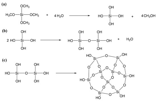 (a) Hydrolysis reaction of TMOS; (b) condensation reaction of TMOS after hydrolysis; (c) further cross-linking by condensation reaction to form a 3D network.