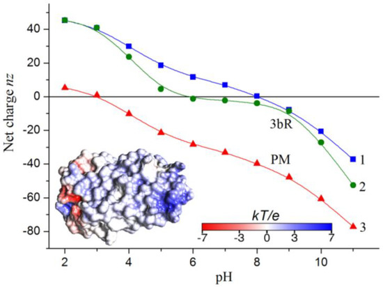 pH-dependences of the net charge nz of the polypeptide chain of bacteriorhodopsin trimer (3bR) in folded (curve 1) and unfolded (curve 2) conformation, and nz of purple membrane (PM, curve 3). Insert: Molecular model of single bR macromolecule horizontally oriented with the cytoplasmic side on the left. The colors correspond to the sign (red—negative and blue—positive) and the value of the electrostatic potential on the intramembrane surface of the bR monomer in the range of −7 kT/e to +7 kT/e, where e—the elementary charge, k—Boltzmann constant, and T—absolute temperature; kT/e = 25.26 mV at 20 °C.
