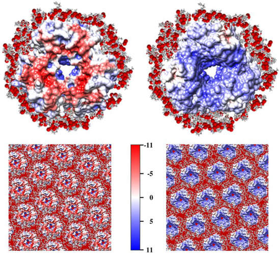 Molecular models of bacteriorhodopsin trimer (3bR) with adjoining 30 lipid molecules (the upper two pictures) and a part of the purple membrane (the lower two pictures). The left two pictures show the intracellular (cytoplasmic) surface of bR and PM and the right two pictures show the extracellular surface. The colors correspond to the sign and value of the electrostatic potential at pH 6.0: Negative (red) and positive (blue) in the range of −11 kT/e to +11 kT/e. The red points around the bR trimer represent the oxygen atoms in the heads of the lipid molecules.