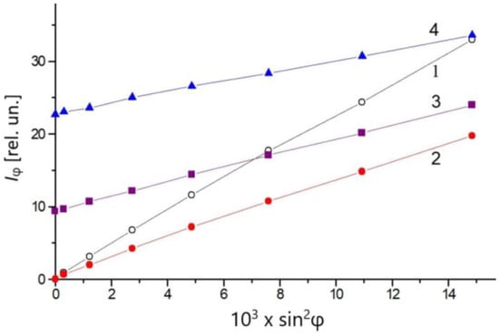 The observed Iφ(0°) > 0 of composite agarose gels can be caused by: (a) Circular birefringence, which appears as a rotation of the polarization plane; (b) linear birefringence of an optically anisotropic medium (Δn0 ≠ 0); and/or (c) circular dichroism. The last two effects lead to elliptic polarization of the transmitting light. In order to separate these three effects, it must be taken into account that they affect the slope of the decrossing angle dependence Iφ = f(sin2φ) differently. At the elliptic polarization, the slope decreases without breaking the linear dependence, while the optical rotation shifts and deforms the curve with small values of sin2φ, but without substantially changing its slope at large sin2φ. Figure 3 (lines 3 and 4) shows that the dependence Iφ = f(sin2φ) is linear, but has a smaller slope, and the minimal Iφ value is observed at φ = 0°; this means that there is no optical rotation in gels where Iφ(0°) > 0. Thus, the results show the absence of measurable optical activity (circular birefringence) (see Section 2.7); the light transmitting through the composite gel becomes elliptically polarized. This is an indication of linear birefringence or circular dichroism. Both satisfy the criterion Iφ (0°) > 0.