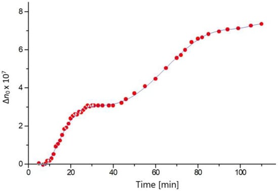 The data in Table 1 show that the spontaneous optical anisotropy Δn0 of the composite agarose gels (containing PM with low constant concentration) is significantly higher at 24 h in comparison with 2 h after gelation. This suggests that the Δn0 increase is caused by maturation of the agarose net and can be verified by investigating the dependence of Δn0 of pure agarose gel on the time t [min]; using pure gel excludes the possible role of PM as an initiator of the maturation, in contrast to the composite gels. The kinetics Δn0(t) (Figure 5) shows that Δn0 of a pure agarose gel has three stages: The fresh gel is optically isotropic (Δn0 ≈ 0) at nearly 10 min after sol-gel transition (lag-phase); then, the anisotropy emerges and its value increases with time in two stages (Section 2.10).