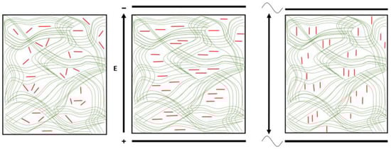 Figure 4 shows that the sign of EOE for the anisotropic composite gels is the opposite to that of PM in water suspension. Therefore, the electrically induced anisotropy ΔnE has the opposite sign to the spontaneous optical anisotropy Δn0 of agarose gel and the absolute value of ΔnE is lower compared to Δn0. Considering the positive sine (+ΔnE) at a kilohertz orientation of PM, it can be inferred that the spontaneous optical anisotropy of agarose gel has a negative sign: −Δn0 (Section 2.11) This means that the fibers of the gel net have predominant orientation in parallel to the electrode surface.