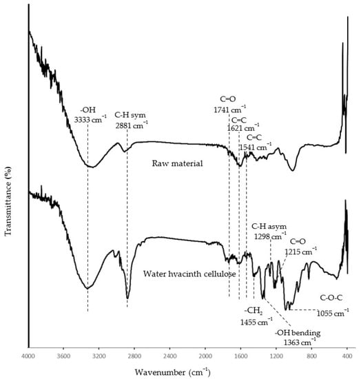To ensure a high content of cellulose in the isolated product, the extracted matter was investigated using an FTIR spectrometer to identify the cellulose functional groups. Overall, the spectrum of raw material (petiole of water hyacinth) showed a similar pattern regarding the water hyacinth cellulose, but the extracted cellulose showed a clearer shape and more defined peaks when compared to the raw material (Figure 2). This indicated the isolated product was more purified and contained a relatively higher content of cellulose than the raw material. Thus, the isolated product could be referred to as water hyacinth cellulose (WHC). The FTIR spectra of the WHC in Figure 2 showed significant peaks at 3333 and 2881 cm−1, corresponding to the -OH stretching and C-H stretching, respectively. Moreover, the bands at 1455, 1363, 1298, and 1055 cm−1 relate to -CH2 scissoring, -OH bending, C-H asymmetric stretching, and the C-O-C pyranose ring, respectively. [23,24]. All the bands mentioned above correspond to the cellulose structure. However, the absorption bands at 1741 and 1215 cm−1 are associated with the C=O stretching group of acetyl group in hemicellulose. The peaks at 1621 and 1541 cm−1 relate to C=C aromatic ring stretching and C-H deformation in lignin, respectively [23]. These observations indicate that some hemicellulose and lignin remained in the extracted cellulose from the water hyacinth. This conclusion was possible and reasonable because several studies isolating cellulose from water hyacinth with alkaline hydrolysis and bleaching found that the isolated product consisted of hemicellulose and lignin as a minority [5,8]. For example, Tanpichai et al. [5] found that the obtained cellulose consisted of 82.5% w/w of cellulose, 4.1% w/w of hemicellulose, and 1.8% w/w of lignin. Pakutsah and Aht-Ong [8] found that the extracted cellulose was composed of cellulose (76.6% w/w), small amounts of hemicellulose (14.9% w/w), and lignin (1.6% w/w).