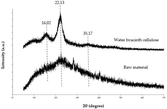 X-ray diffraction of water hyacinth cellulose and raw material.