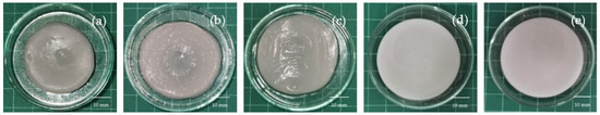 The appearance of WHC-composited hydrogels: C1A0.5P0.5 (a), C1.5A0.5P0.5 (b), C2A0.5P0.5 (c), C2.5A0.5P0.5 (d), and C3A0.5P0.5 (e).