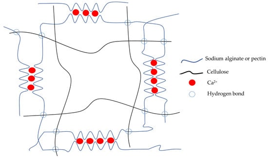 The scheme of the mechanism of hydrogel formation is shown in Figure 5. COO− groups of sodium alginate and pectin interact with Ca2+ to form the primary structure of the hydrogel. Cellulose forms hydrogen bonds with pectin and the alginate polymer chain to enhance the stability and strength of the hydrogel.
