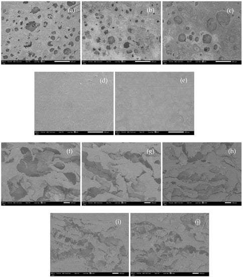 SEM micrographs of the surface and cross section of WHC-based cryogels at 50 and 100 magnifications. (a) = surface of C1A0.5P0.5, (b) = surface of C1.5A0.5P0.5, (c) = surface of C2A0.5P0.5, (d) = surface of C2.5A0.5P0.5, (e) = surface of C3A0.5P0.5, (f) = cross-sectional image of C1A0.5P0.5, (g) = cross-sectional image of C1.5A0.5P0.5, (h) = cross-sectional image of C2A0.5P0.5, (i) = cross-sectional image of C2.5A0.5P0.5, and (j) = cross-sectional image of C3A0.5P0.5.