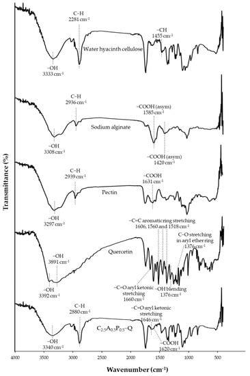 FTIR examination indicated possible interactions in materials via chemical shifts or intensity changes, relating to chemical interactions among substances [35]. The FTIR spectra are shown in Figure 7. Additionally, the -OH peak change in the range 3170–3560 cm−1 may indicate hydrogen bond interactions in the hydrogel [36]. The crucial peaks of cellulose are -OH stretching and C-H stretching at 3333 and 2881 cm−1, respectively. In sodium alginate spectra, the wide band around 3308 cm−1 corresponds to -OH stretching. Moreover, the bands at 1585 and 1402 cm−1 relate to -COOH asymmetric and symmetric stretching, respectively [37,38]. The observed bands of pectin at 3297, 2939, and 1624 cm−1 correspond to -OH stretching, C-H stretching, and -COOH asymmetric stretching, respectively [39,40]. In quercetin spectra, the wide bands at 3392 and 3291 cm−1 correspond to -OH stretching. The sharp peak at 1660 cm−1 relates to C=O aryl ketonic stretching. The three peaks at 1606, 1560, and 1518 cm−1 correspond to C=C aromatic ring stretching, and the peak at 1250 cm−1 refers to C-O stretching in the aryl ether ring. Moreover, the peak band at 1376 cm−1 relates to -OH bending [35,41,42]. In the spectra of C2.5A0.5P0.5 containing quercetin (C2.5A0.5P0.5-Q), -COOH stretching of sodium alginate and pectin at 1585 and 1624 cm−1 shifted to 1620 cm−1, indicating the ionic interaction between Ca2+ and -COOH of sodium alginate and pectin during the crosslinking process. However, -COOH symmetric stretching of sodium alginate at 1402 cm−1 cannot be investigated because its peak overlapped with -CH stretching of WHC at 1455 cm−1. Moreover, the C2.5A0.5P0.5-Q spectra indicated that the OH peak changed to 3340 cm−1 in the region 3170–3560 cm−1, which showed relatively lower intensity. It may indicate hydrogen bonds between hydrophilic polymers—for instance, cellulose–sodium alginate, cellulose–pectin, and cellulose–quercetin [43,44]. Moreover, the peak of -OH bending of quercetin at 1376, shifting to 1363 cm−1 in C2.5A0.5P0.5-Q spectra, also possibly indicated hydrogen bonding with water hyacinth and/or other polymers in the formulation. Water hyacinth cellulose could form hydrogen bonding with quercetin. To clarify, several hydroxyl groups in quercetin molecules can form hydrogen bonds with oxygen atoms and hydroxyl groups in cellulose molecules [42,44]. Furthermore, the shift in the carbonyl peak of quercetin at 1660 cm−1 to a lower frequency at 1646 cm−1 in C2.5A0.5P0.5-Q also indicates the occurrence of hydrogen bonding [45]. The occurrence of a new peak of quercetin in the hydrogel was observed difficulty because several peaks of quercetin were overlapped by the peaks of cellulose, sodium alginate, and pectin. However, this study showed that the possible chemical interaction between water hyacinth cellulose and quercetin might be hydrogen bonding, formed by oxygen and hydrogen atoms in both molecules.