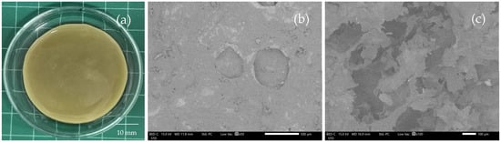 The visual appearance (a) and SEM micrograph of the surface and cross-section of C2.5A0.5P0.5-Q at 50× and 100× magnifications (b,c).