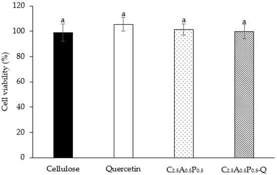 HaCaT cell viability after exposure to cellulose, quercetin, C2.5A0.5P0.5, and C2.5A0.5P0.5-Q. The results are demonstrated as mean ± S.D.; superscripts with the same letter (a) in each bar indicate an insignificant difference between samples (p > 0.05).